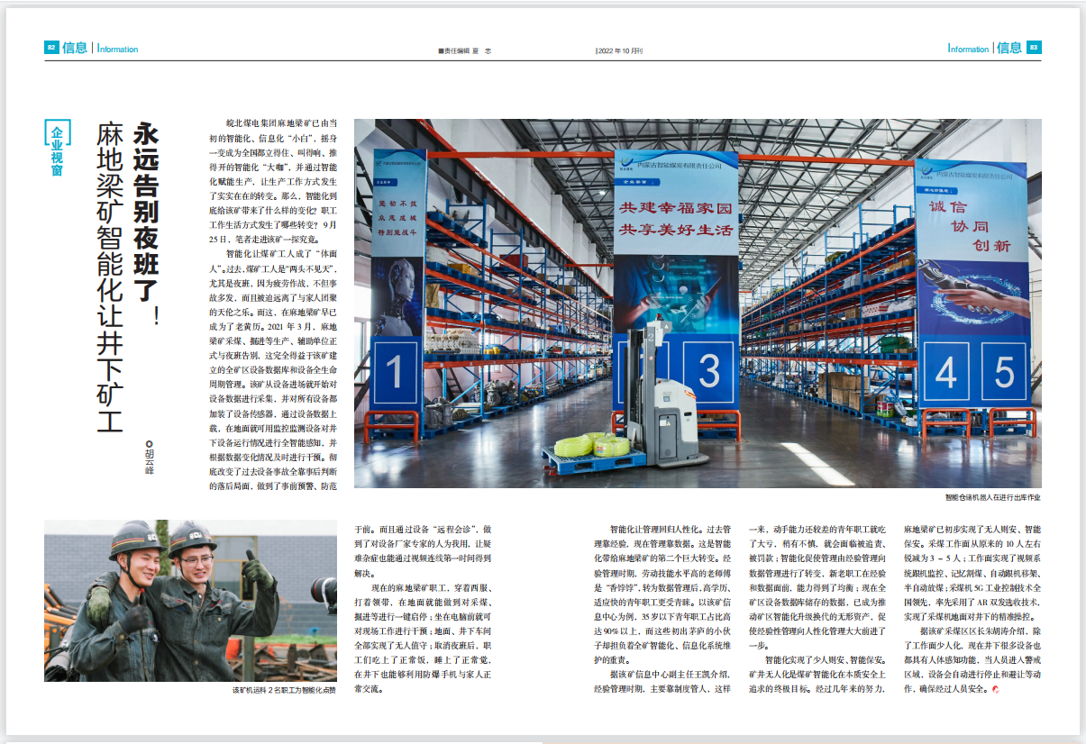 現(xiàn)在的麻地梁礦職工,穿著西服、打著領(lǐng)帶,在地面就能做到對采煤、掘進(jìn)等進(jìn)行一鍵啟停;坐在電腦前就可對現(xiàn)場工作進(jìn)行干預(yù);地面、井下車間全部實(shí)現(xiàn)了無人值守;取消夜班后,職工們吃上了正常飯,睡上了正常覺,在井下也能夠利用防爆手機(jī)與家人正常交流?!叭∠拱?,就是爽!”談到取消夜班后的感受,1名采煤職工高興地說。