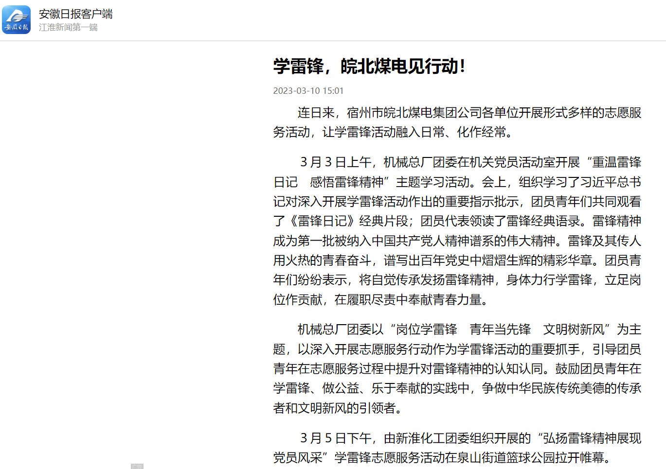 3月10日安徽日?qǐng)?bào)客戶(hù)端:學(xué)雷鋒 ,皖北煤電見(jiàn)行動(dòng)